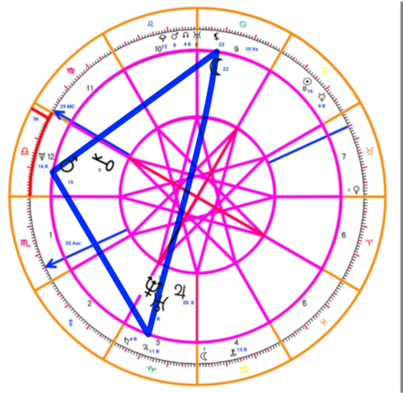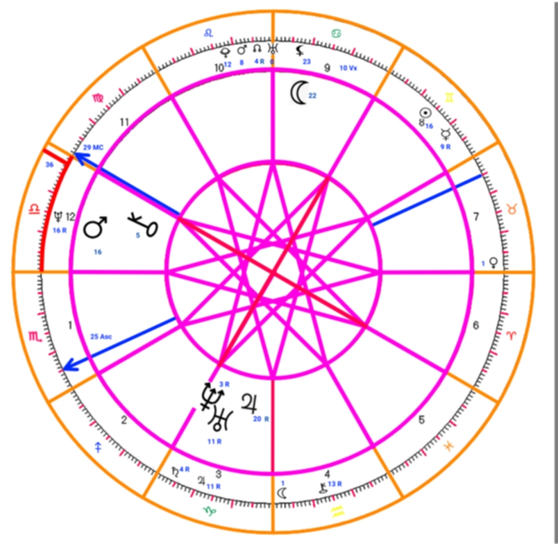 Her transit at 1 degrees of Libra was conjunct Mars transiting at 16 degrees, Chiron transiting at 5 degrees and her natal Mercury retrograde at 16 degrees of Libra. Her transit formed a square with Jupiter transiting at 20 degrees, Uranus retrograde at 11 degrees, Neptune retrograde at 3 degrees, her natal Saturn retrograde at 4 degrees, her natal Jupiter at 11 degrees of Capricorn and also formed a square with the Moon transiting at 22 degree were her natal Lilith is stationed at 23 degrees and her vertex at 10 degrees of Cancer.