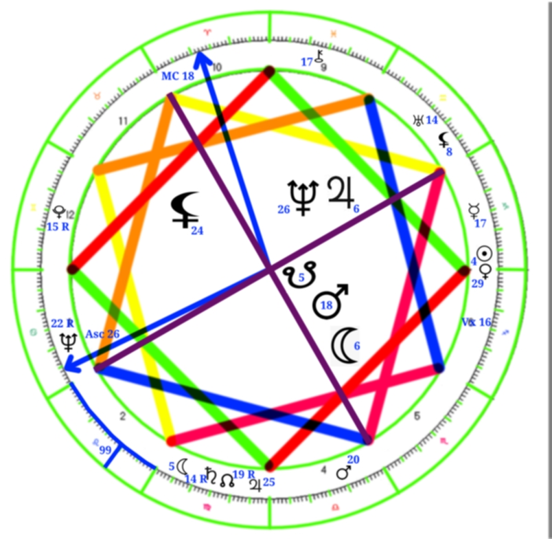 Interpretation – She was transiting at 16 degrees of Leo at 16 degrees. Her transit was opposite expansive Jupiter transiting in her 11th house of Aquarius at 24 degrees. Her transit was conjunct Neptune retrograde at 28 degrees of Leo.