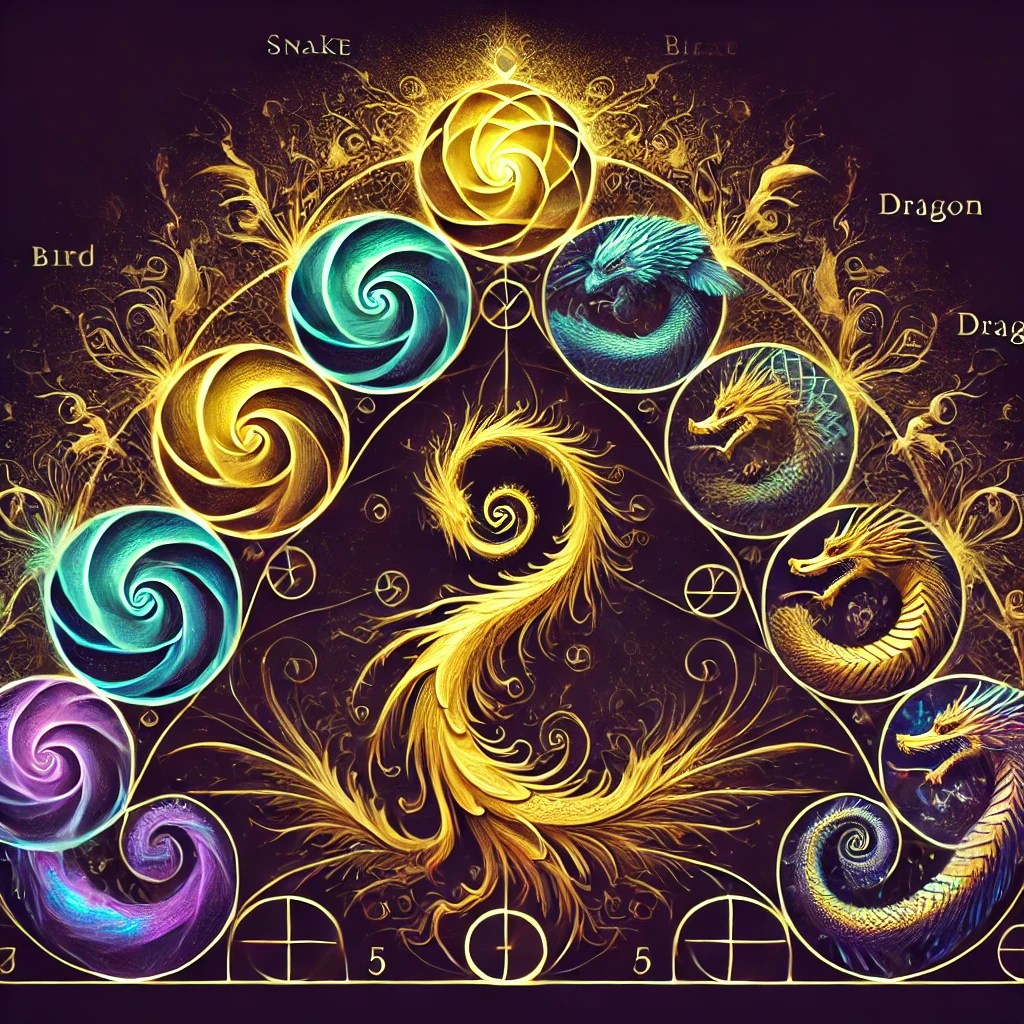 Visual AI Representation of the Dragon Family Tree using mathematical and symbolic rules. This tree will follow the Fibonacci sequence structure while incorporating the three-state transformation of dragonization (Snake → Bird → Dragon).